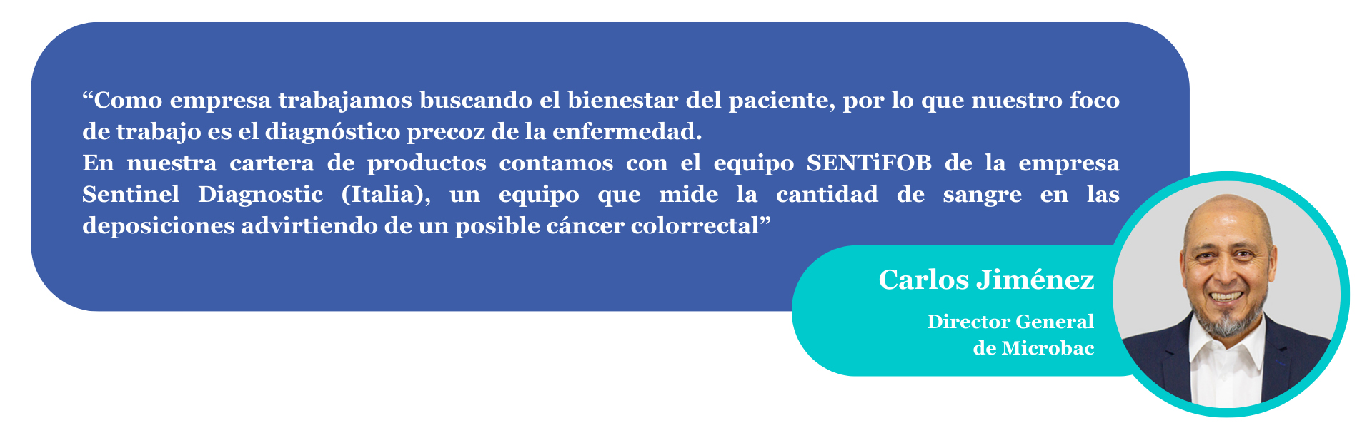 “Como empresa trabajamos buscando el bienestar del paciente, por lo que nuestro foco de trabajo es el diagnóstico precoz de la enfermedad. En nuestra cartera de productos contamos con el equipo SENTiFOB de la empresa Sentinel Diagnostic (Italia), un equipo que mide la cantidad de sangre en las deposiciones advirtiendo de un posible cáncer colorrectal”, señala Carlos Jiménez, Director General de Microbac.