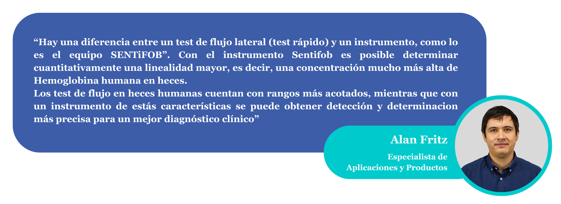 Sobre la eficacia de este equipo, Alan Fritz, Especialista de Aplicaciones y Productos y encargado de SAC, comenta “Hay una diferencia entre un test de flujo lateral (test rápido) y un instrumento, como lo es el equipo SENTiFOB”. Con el instrumento es posible obtener una linealidad, es decir, una concentración mucho más alta de lo que se busca. Los test de flujo como por ejemplo los de orina, hormonas, etc, cuentan con rangos más acotados, mientras que con un instrumento se pueden obtener mayores números”.